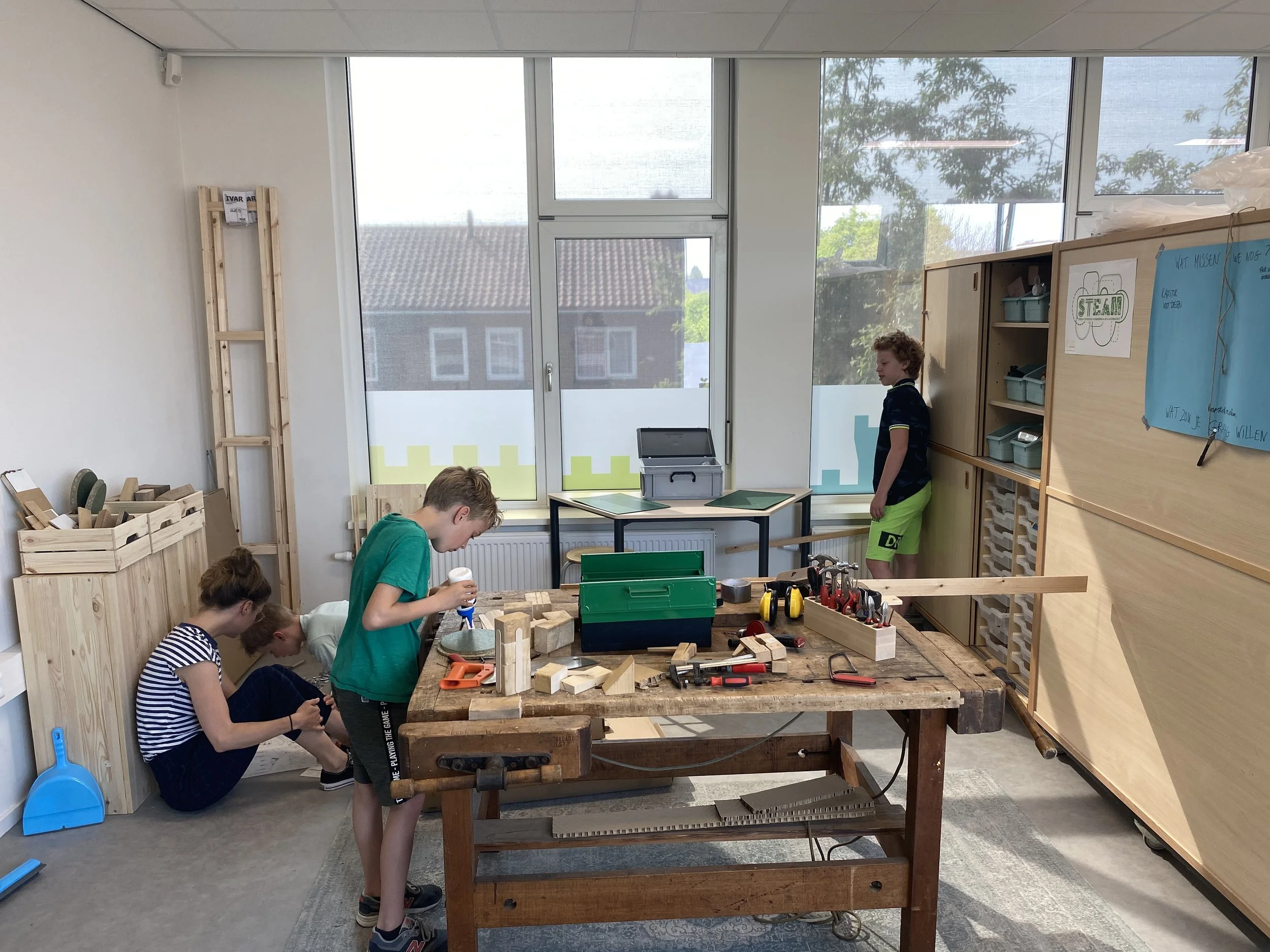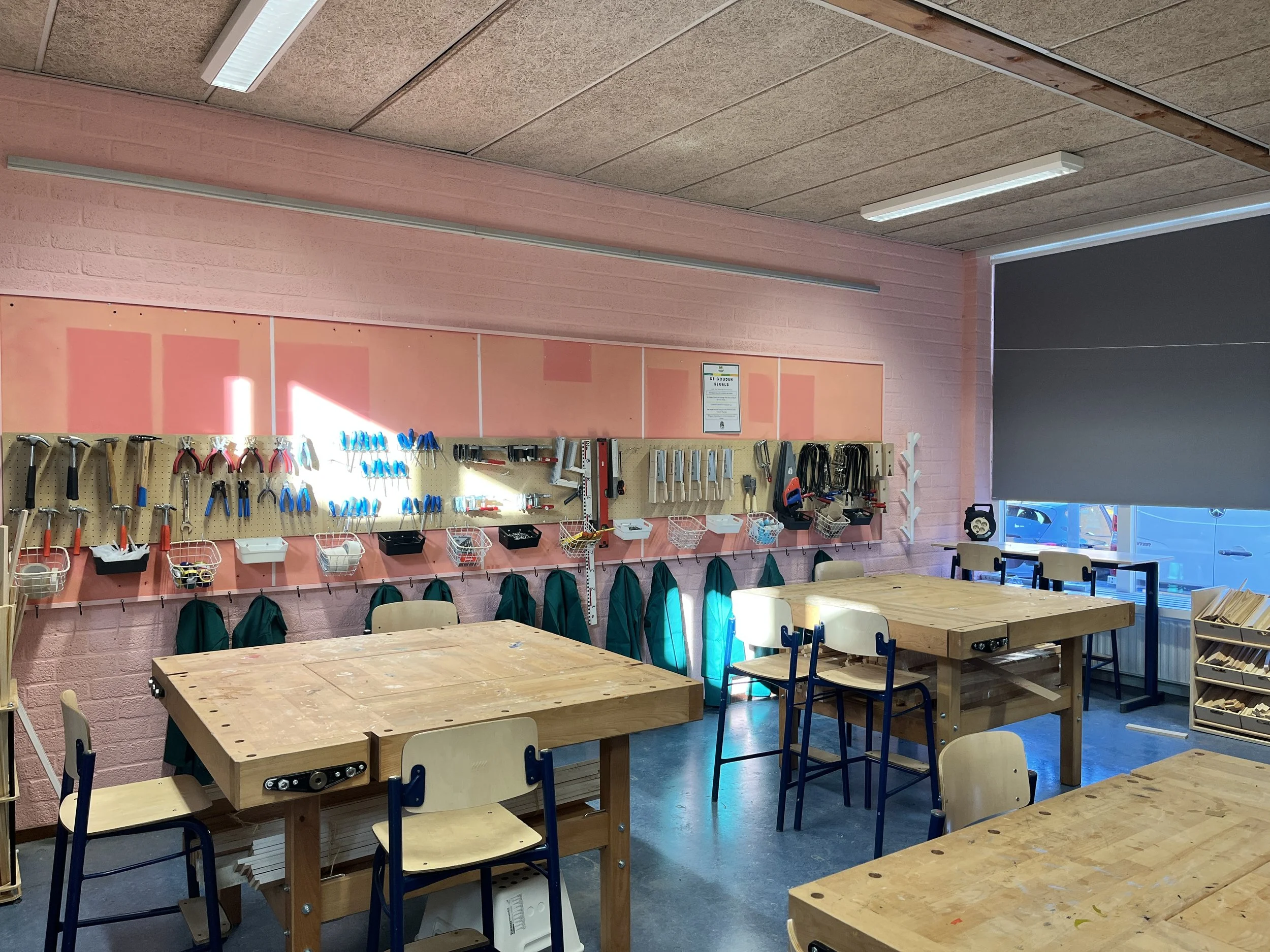 Een mobiele werkplaats; bij de Jules Verne staat in de vorm van een grote kofferkast, met basis gereedschappen & materialen om door de gehele school te gebruiken.